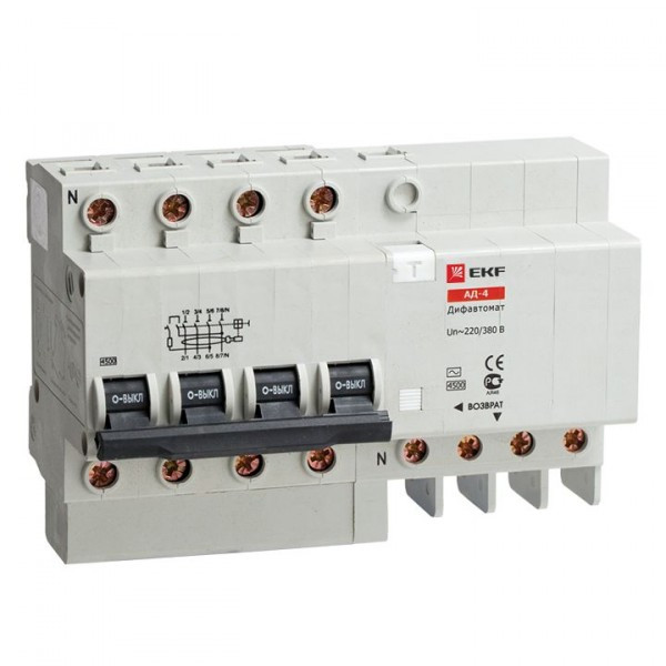 Дифференциальный автомат АД-4 32А/30мА (характеристика C, тип AC) 4,5кА EKF | DA4-32-30 | EKF