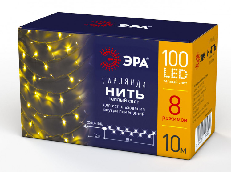 Гирлянды ENIN-10B Гирлянда LED Нить 10 м теплый свет 8 режимов, 220V, IP20 | Б0041894 | ЭРА