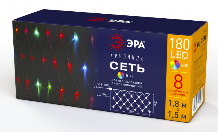 Гирлянды ENIS-01R Гирлянда LED Сеть 1,8 м*1,5 м RGB 8 режимов, 220V, IP20 | Б0041902 | ЭРА
