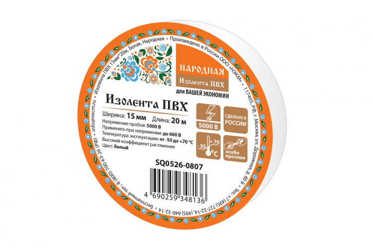 Изолента ПВХ 15мм*20м, Белая, Народная | SQ0526-0807 | TDM