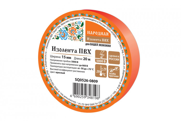Изолента ПВХ 15мм*20м, Красная, Народная | SQ0526-0809 | TDM