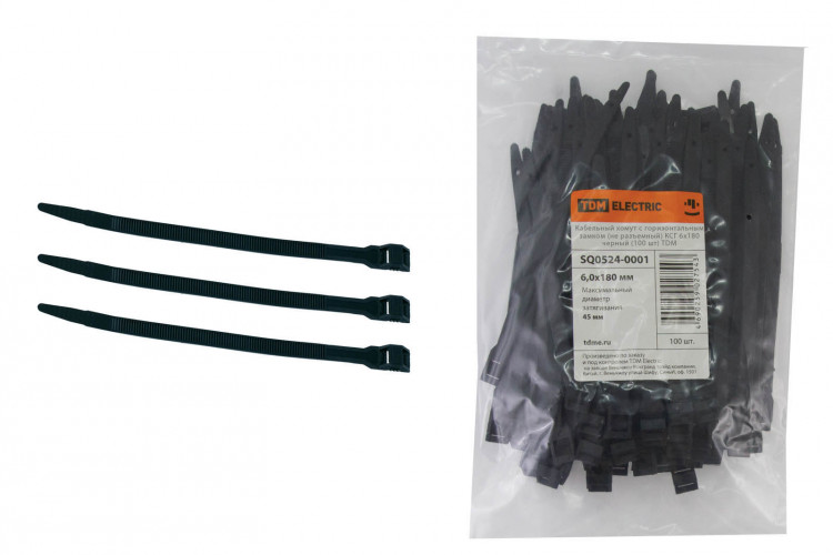 Кабельный хомут с горизонтальным замком (не разъемный) КСГ 6х180 черный (100 шт) | SQ0524-0001 | TDM