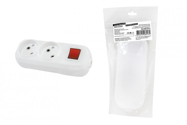 Колодка розеточная 2 гнезда 2П+3 c выключателем 16А 250В белая серии "Народная" | SQ1806-0415 | TDM