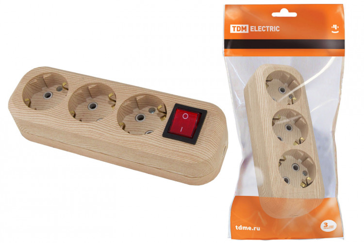 Колодка розеточная 3 гнезда 2П+3 с выключателем16А 250В "Эко" (сосна) | SQ1806-0049 | TDM