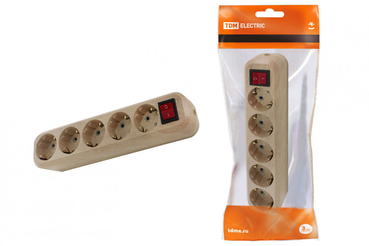 Колодка розеточная 5 гнезд 2П+3 с выключателем16А 250В "Эко" (сосна) | SQ1806-0055 | TDM