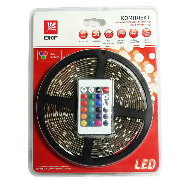 Комплект лента светодиодная FLS-5050 30 сд/м 7,2Вт 12В IP65 5м RGB, драйвер и ИК контроллер EKF Simple | fls-set-5050-30-65-5m-RGB | EKF