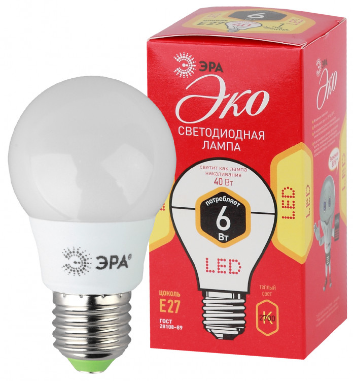 Лампа ECO LED A55-6W-827-E27 (диод, груша, 6Вт, тепл, E27) | Б0028008 | ЭРА