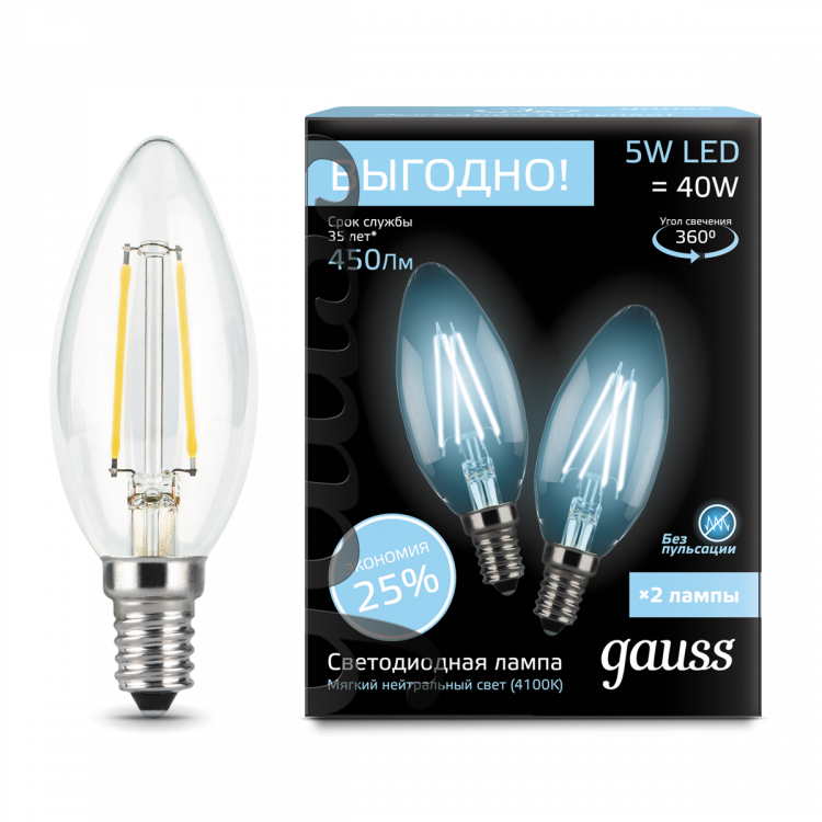 Лампа светодиодная LED 5Вт E14 220В 4100К свеча (2 лампы в упаковке) | 103801205P | Gauss