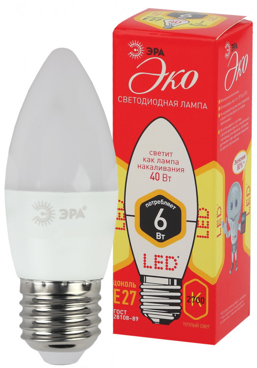 Лампа светодиодная LED 6Вт Е27 220В 2700К smd B35 ECO свеча | Б0020620 | ЭРА