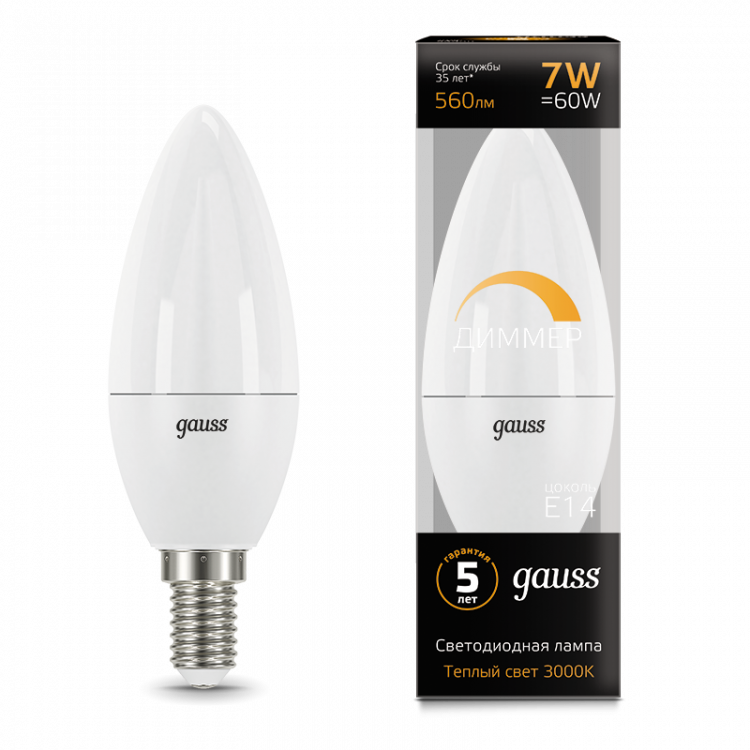 Лампа светодиодная LED 7Вт E14 220В 3000К свеча, диммируемая | 103101107-D | Gauss