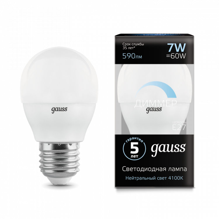 Лампа светодиодная LED 7Вт E27 220В 4100К шар, диммируемая | 105102207-D | Gauss