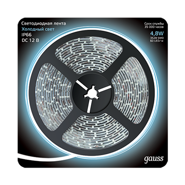 Лента светодиодная 2835/60-SMD 4.8W 12V DC холодный белый IP66 (блистер 5м) | 311000305 | Gauss