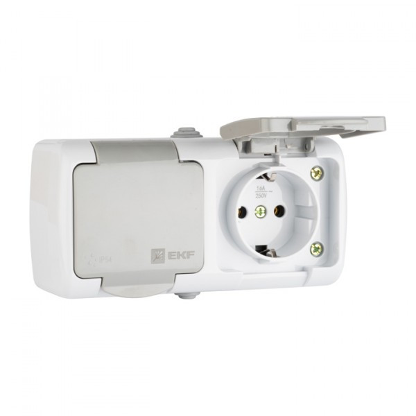 Мурманск Розетка 2-местная 16А с заземлением с крышкой IP54 серый с защитными шторками EKF | EFR16-129-30-54 | EKF