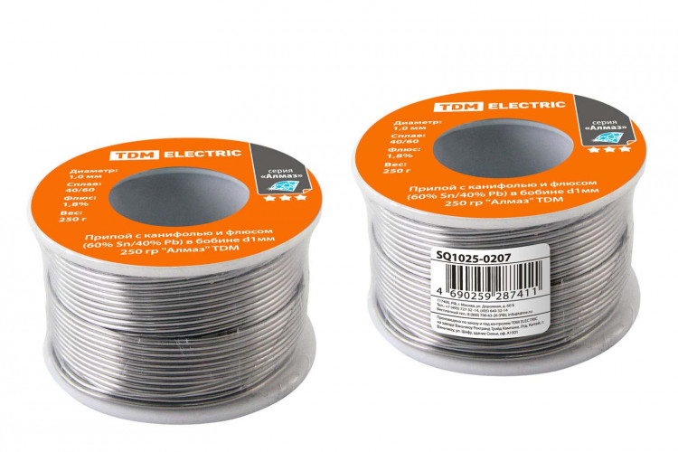 Припой с канифолью и флюсом (60% Sn/40% Pb) в бобине d1мм 250 гр "Алмаз" | SQ1025-0207 | TDM