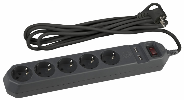 Сетевой фильтр USF-5es-1.5m-USB-B (черный) с заземл, 3x0,75мм2, с выкл, 5гн+2USB, 1.5м (20/600) |Б0019036 | ЭРА
