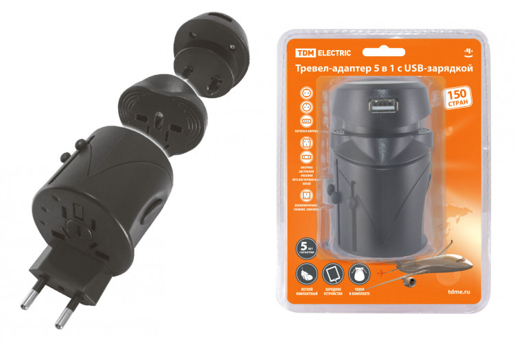 Тревел-адаптер 100-250В 2,5A (5 в 1) c USB-зарядкой 1000мА черный | SQ1806-0144 | TDM