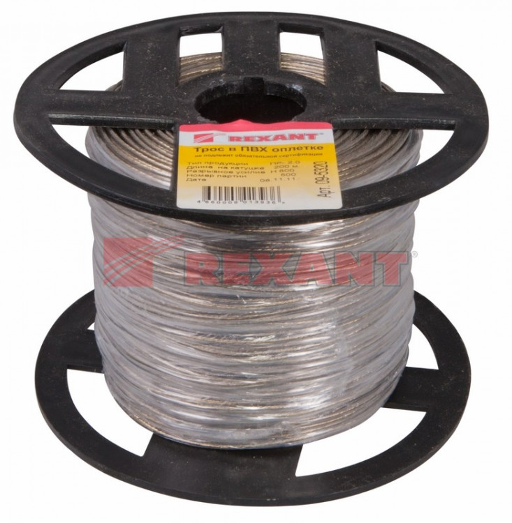 Трос стальной в ПВХ оплетке d=2,0 мм, прозрачный (бухта 200 м) | 09-5320 | REXANT