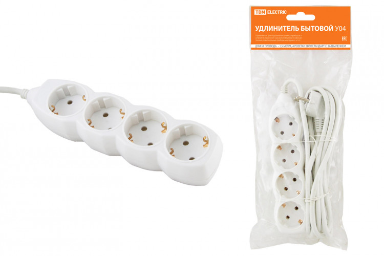 Удлинитель бытовой У04 4 гнезда, 1,5метра, с заземлением, ПВС 3х1мм2 16А/250В | SQ1303-0010 | TDM