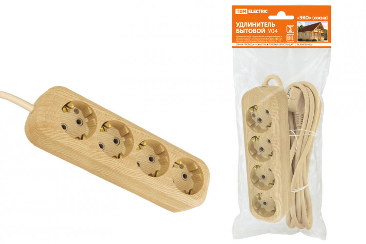 Удлинитель бытовой У04 4 гнезда, 3метра,2П+3, ПВС 3х1мм2 "Эко" (сосна) 16А/250В | SQ1303-2011 | TDM
