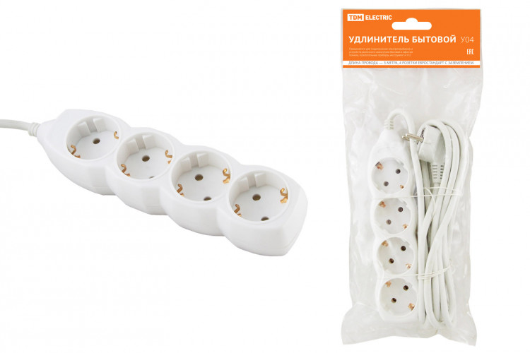 Удлинитель бытовой У04 4 гнезда, 3метра, с заземлением, ПВС 3х1мм2 16А/250В | SQ1303-0011 | TDM