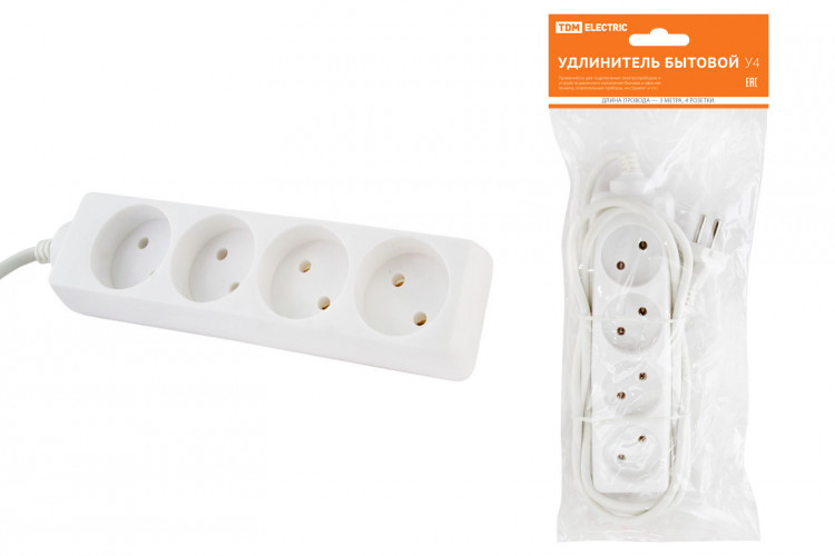 Удлинитель бытовой У4 4 гнезда, 3метра, без заземления, ПВС 2х0,75мм2 10А/250В | SQ1303-0211 | TDM