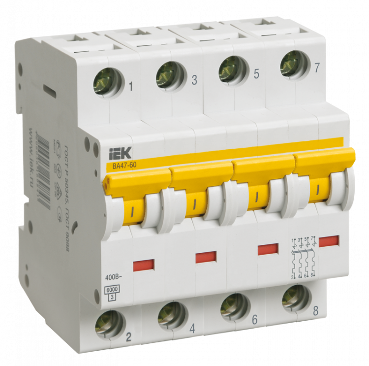 Выключатель автоматический четырехполюсный ВА47-60 2А B 6кА | MVA41-4-002-B | IEK
