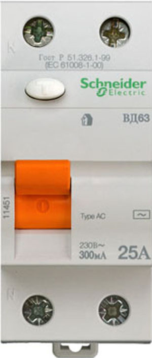Выключатель дифференциальный (УЗО) ВД63 2п 25А 300мА тип AC | 11451 | Schneider Electric